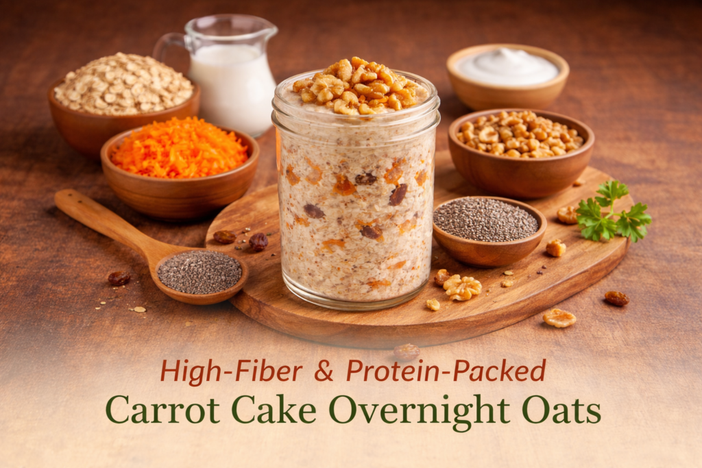 Carrot cake overnight oats is a healthy, fiber-rich breakfast that combines the goodness of oats, carrots, and protein-rich ingredients. It supports digestion, keeps you full for longer, and provides steady energy throughout the day.